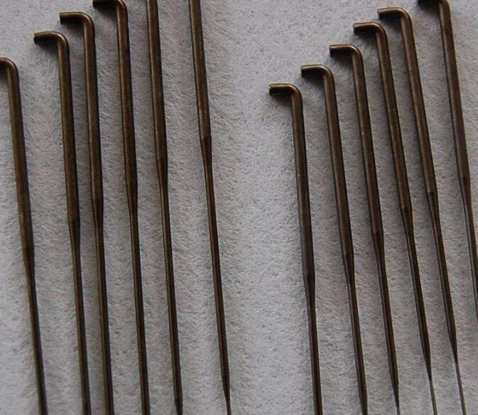 但是,不同的公司在刺針的表示上有一些細(xì)小的差別,如德國(guó)勝家公司推薦的一種能使 纖網(wǎng)得 到較高針 刺密度的刺 針,規(guī)格為15×18×40×3.5RB22A06/06B222P。其中,B22表示針葉長(zhǎng)度是22m;AO6/06表示模壓刺針,鉤刺的高度和深 度均為0.6mm;BD22是表示針葉的三個(gè)棱上均各有2個(gè)鉤刺;PP則表示針尖經(jīng)過磨光處理。又如青島錦佛針業(yè)有限公司的一種又形針,規(guī)格為腰號(hào)(針腰分兩段過渡);D表示彎柄位置(與開叉方向呈90,見圖4-19);J表示錦佛牌;3鎳、鍍鉻拋光處理);倒數(shù)第 二個(gè)1表示叉口寬度(為0.15mm, 極限為0.6mm);倒數(shù)第 一個(gè)1表示叉口深 度(為0.15m,極限大為0.7m)。因此,在選購(gòu)刺針時(shí),比較好的方式是參考生產(chǎn)廠家提供刺針手冊(cè)。